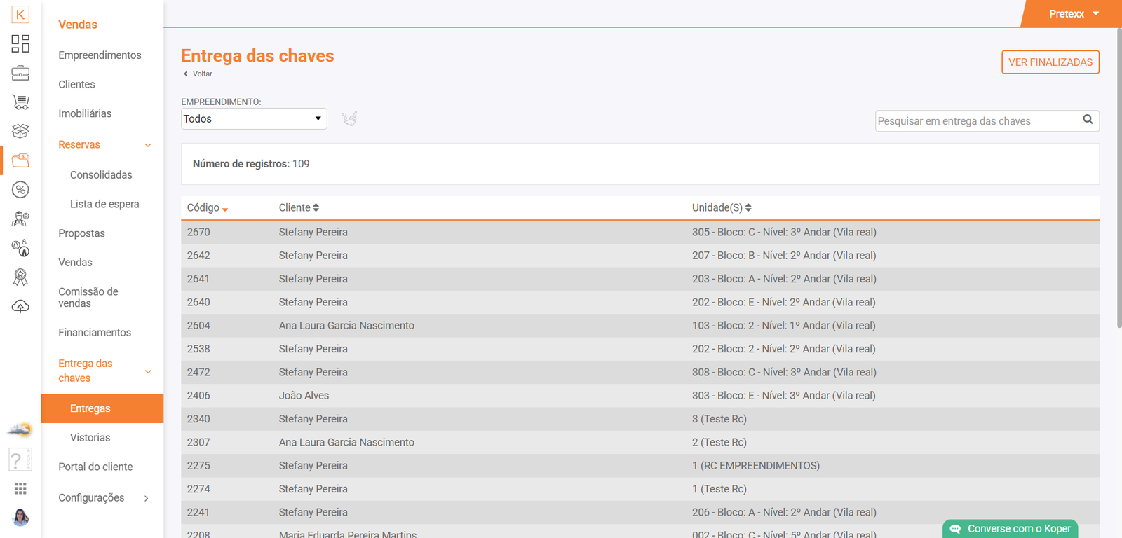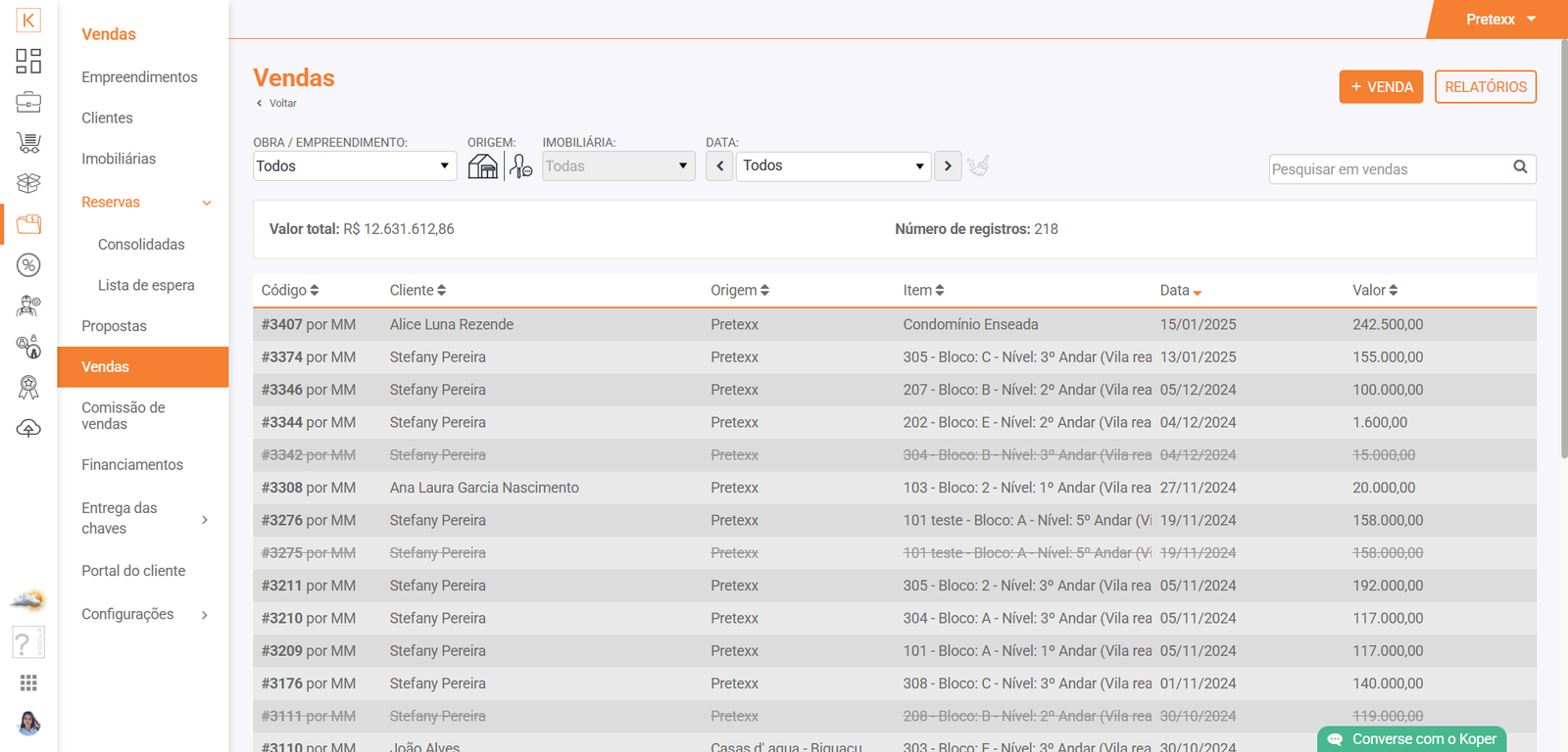 Nessa parte do sistema, o gestor tem acesso irrestrito aos registros e negociações tanto para unidades finalizadas ou na planta. Ainda, pode-se fornecer acesso a imobiliárias parceiras para que elas tomem parte nos processos de venda. Aqui ainda o usuário pode efetuar propostas e reservas em nome de clientes, configurar etapas de entrega das chaves, etc.