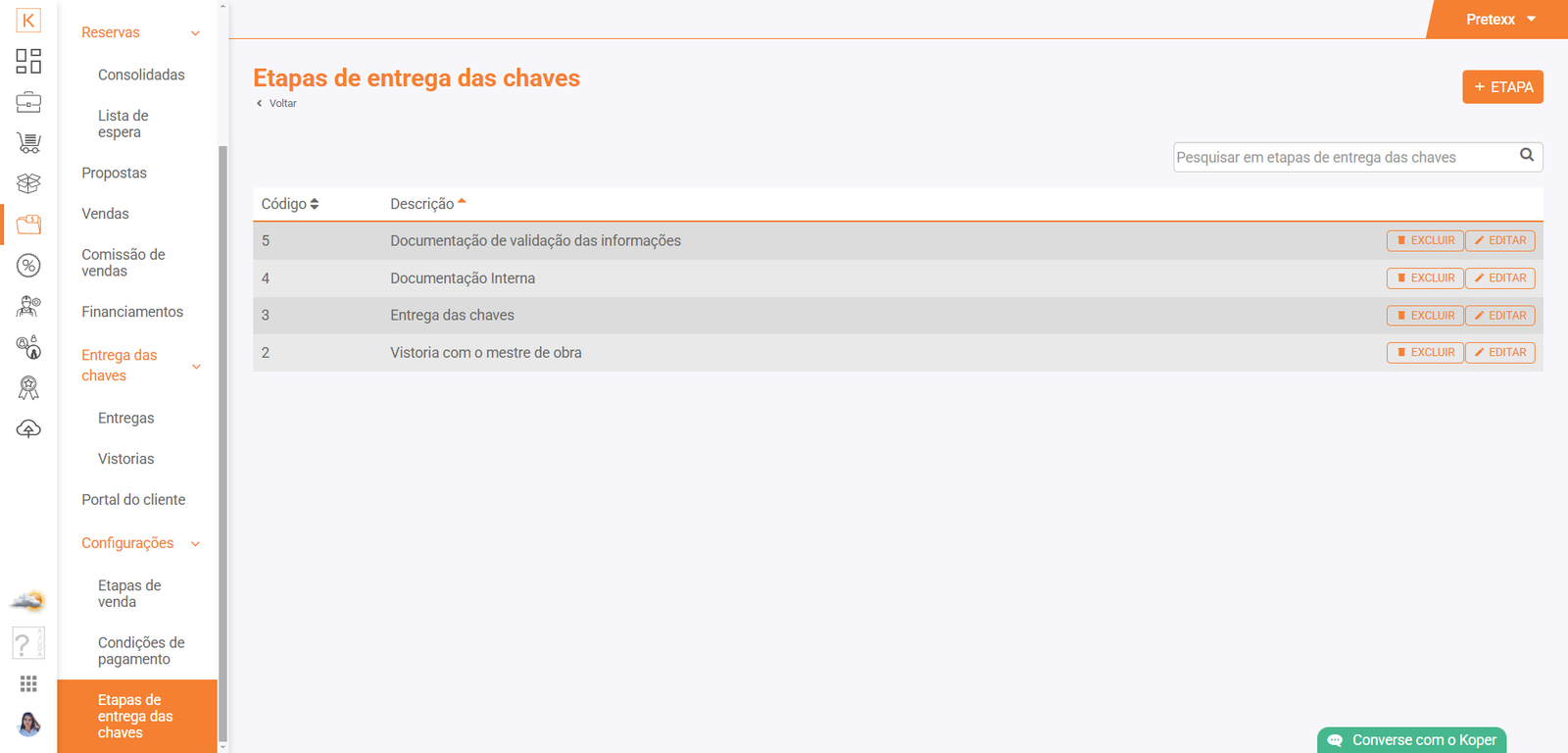 Esta aba é reservada à vinculação de uma nova etapa de entrega das chaves em empreendimentos específicos, como visto na imagem acima.