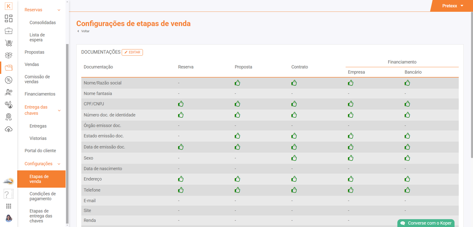 Aqui o usuário editará a documentação a ser solicitada para cada etapa da venda, para financiamentos, etc.