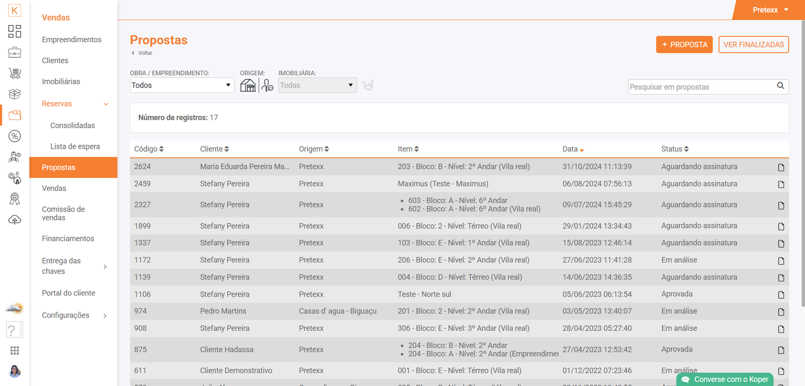 Nessa aba, ficam registrados os clientes com quem a construtora/incorporadora negocia. É possível visualizar seu cadastro e histórico de negociações.