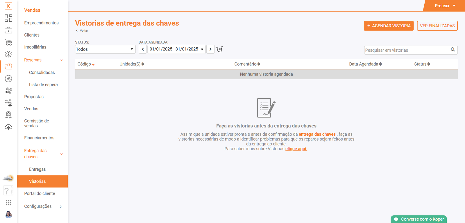 Esta parte serve para agendar vistorias de entregas de chaves e visualizar as realizadas previamente, agrupando-as por data vigente e demais filtros de pesquisa.