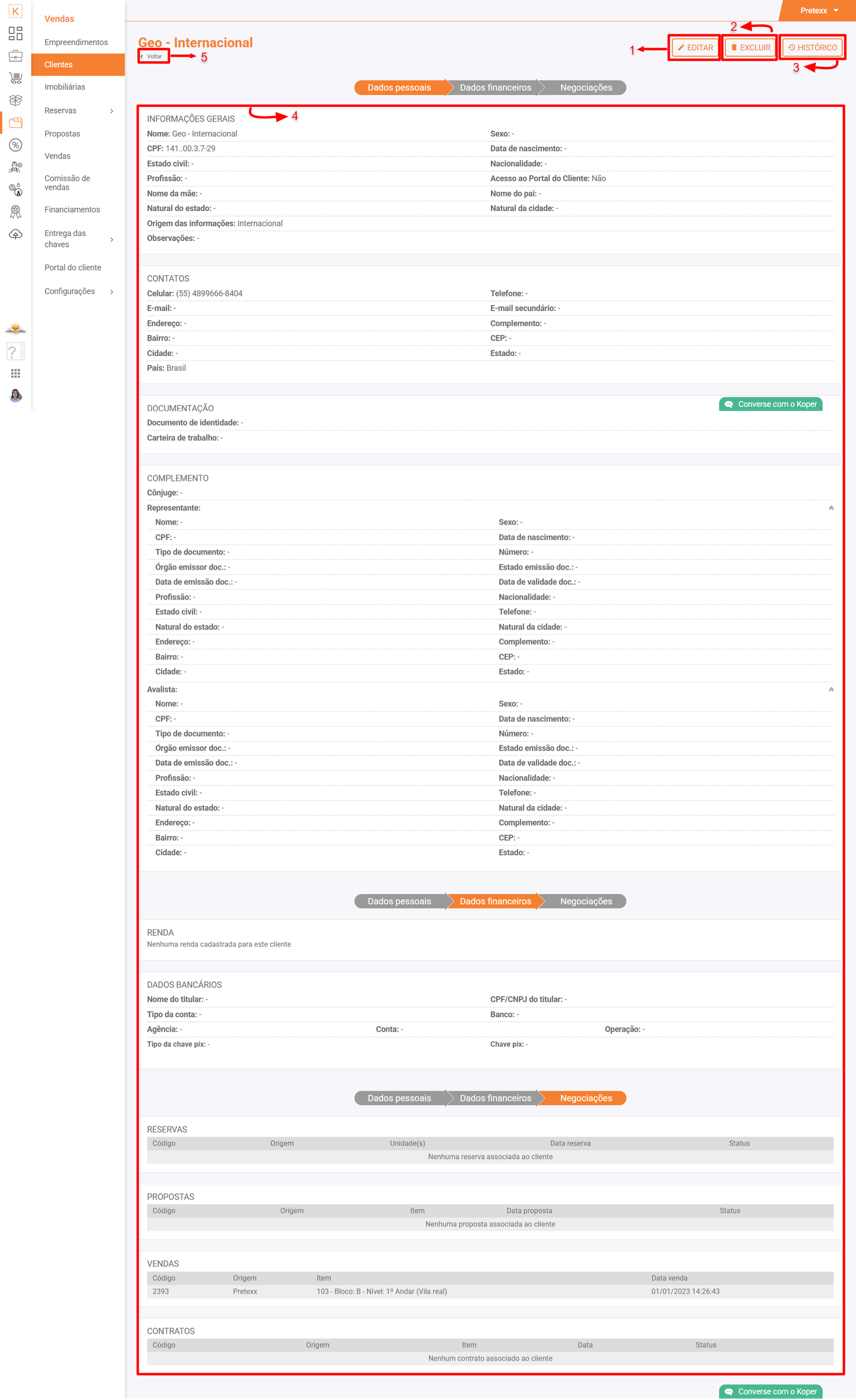 - 4. Além de ver informações de dados pessoais (informações gerais , contatos, documentações e complementos), Dados financeiros (renda e dados bancários) e Negociações (reservas, propostas, vendas e contratos);