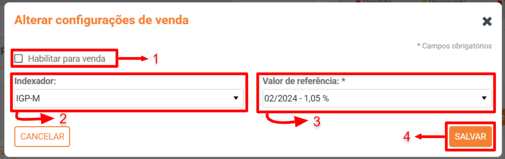 - Só será possível fazer alterações nas configurações de venda em empreendimentos cuja característica da obra for "Obra própria";
