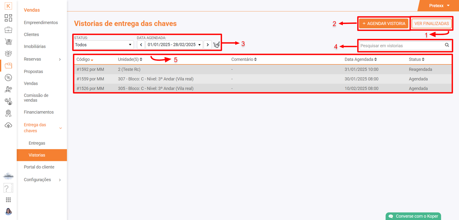 Acesse Koper > Vendas > Entrega das chaves > Vistorias