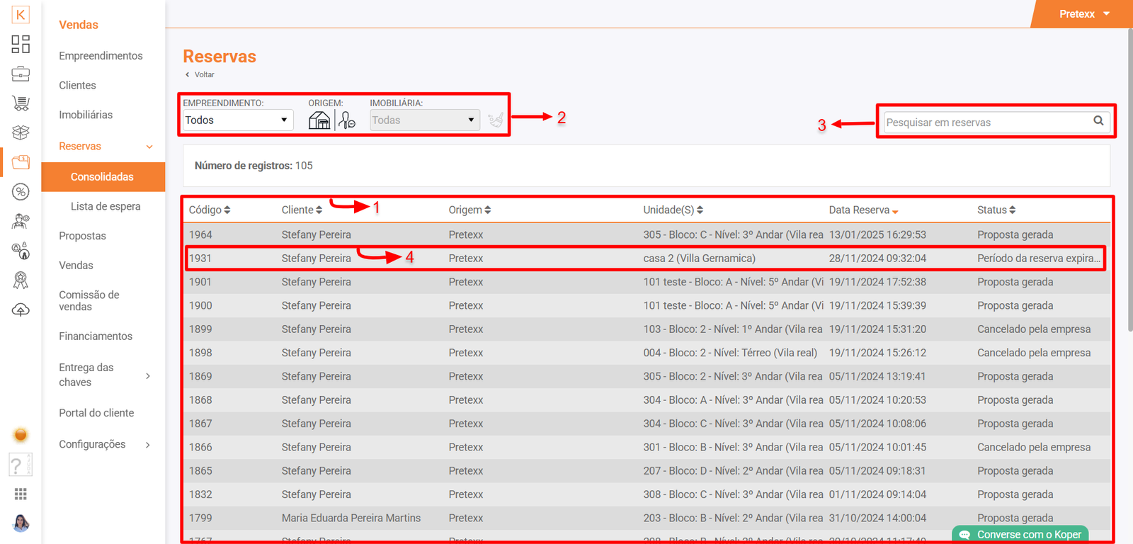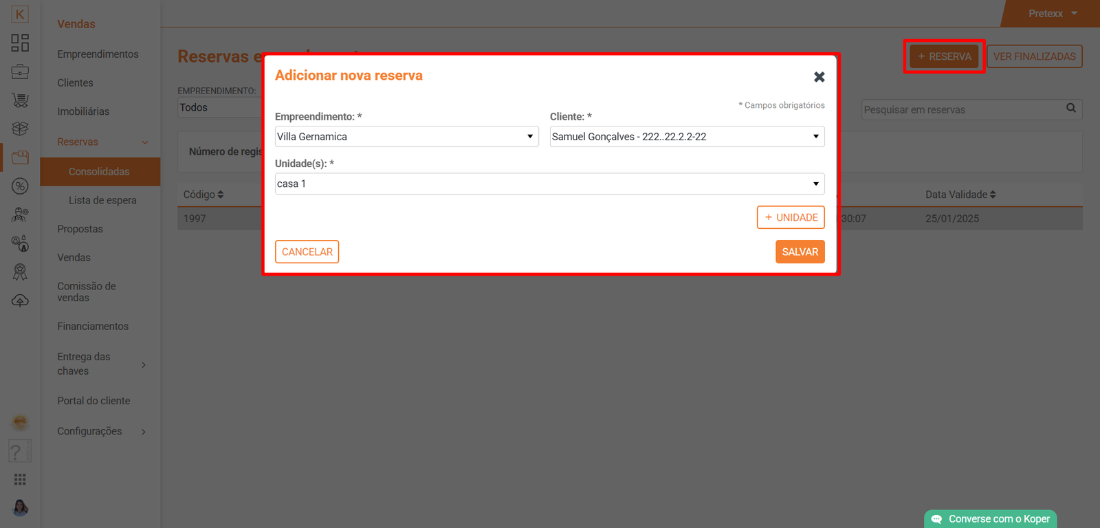 Acesse Koper > Vendas > Reservas > Consolidadas