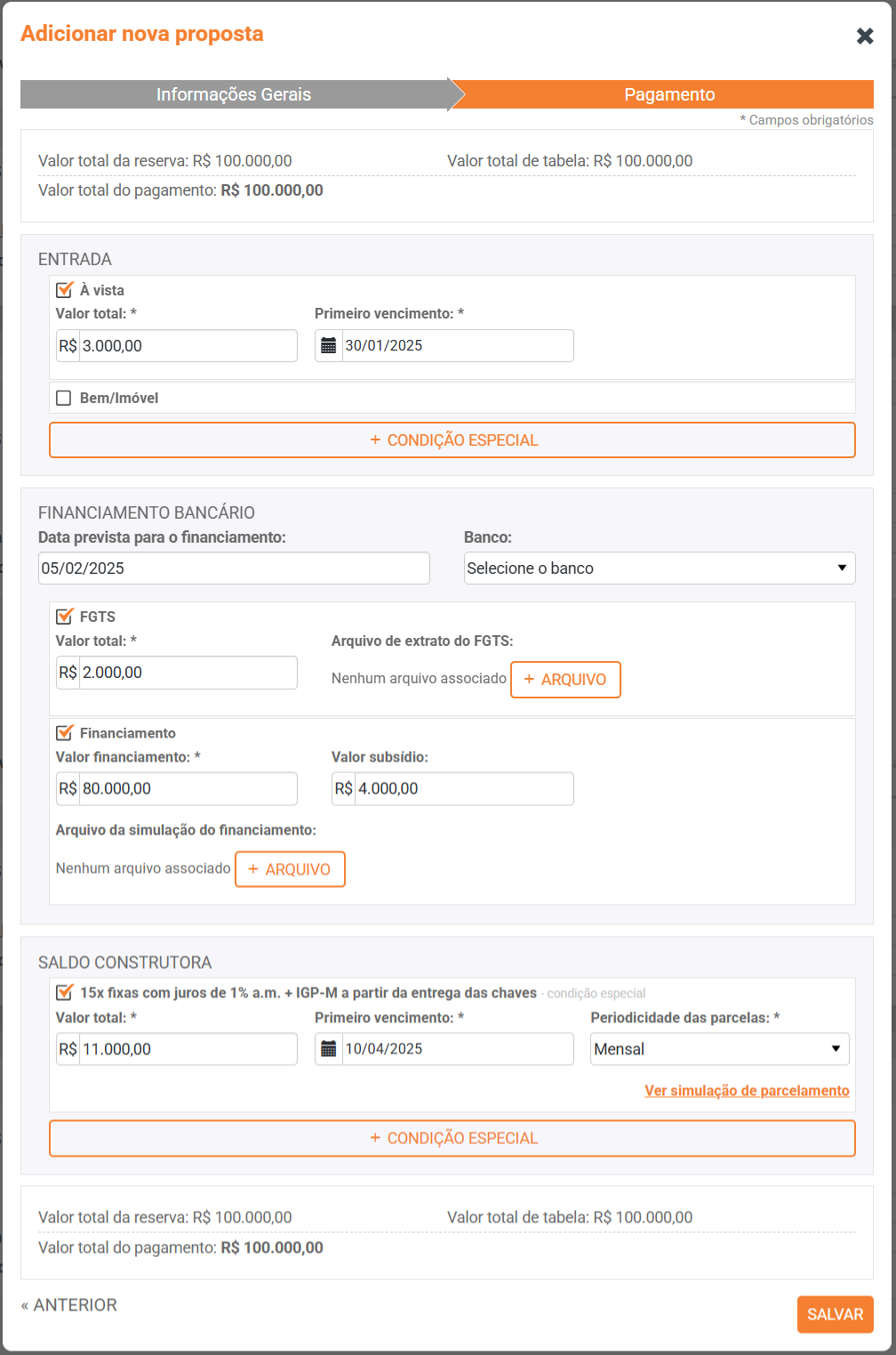 - Agora elabore sua proposta de pagamento (Entrada, financiamento bancário ou financiamento com a sua empresa, se terá subsídio, fará uso de FGTS e/ou se existe alguma outra forma de condição especial);