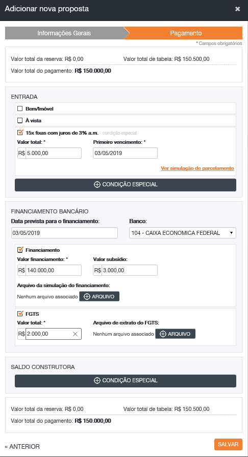 - Agora elabore sua proposta de pagamento (Entrada, financiamento bancário ou financiamento com a sua empresa, se terá subsídio, fará uso de FGTS e/ou se existe alguma outra forma de condição especial);