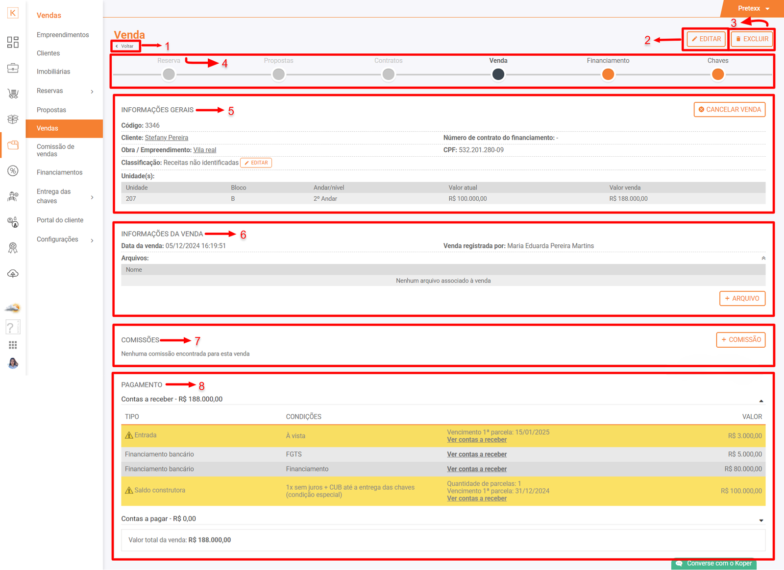 - venda do empreendimento ela possuirá 4 etapas no fluxo de venda - orçamento, proposta, contrato, venda