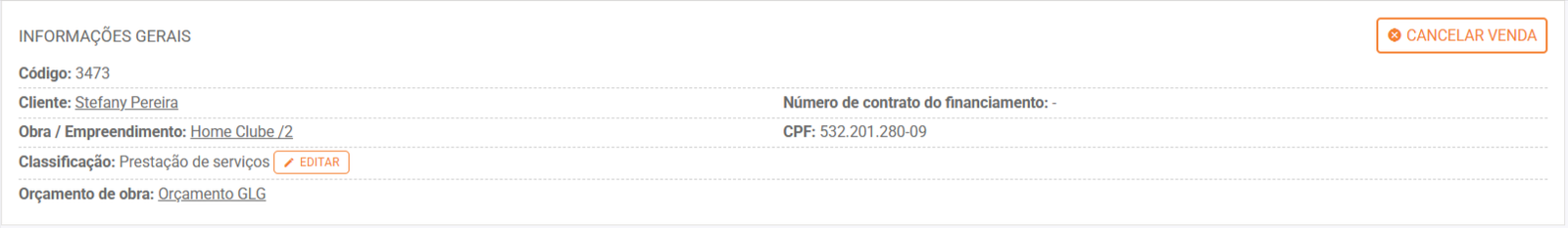 - Se for Obra de cliente: obra/empreendimento, classificação, cliente, data de venda e Orçamento de obra.