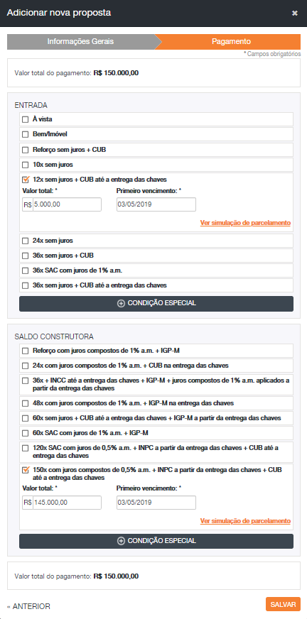 - Vale lembrar que em obras para clientes, em Pagamento só é apresentado o painel ENTRADA e SALDO CONSTRUTORA, não deixando a opção de financiamento com o banco liberada;