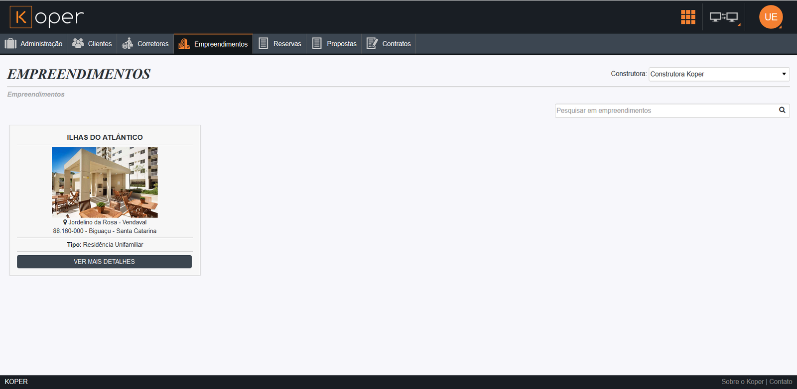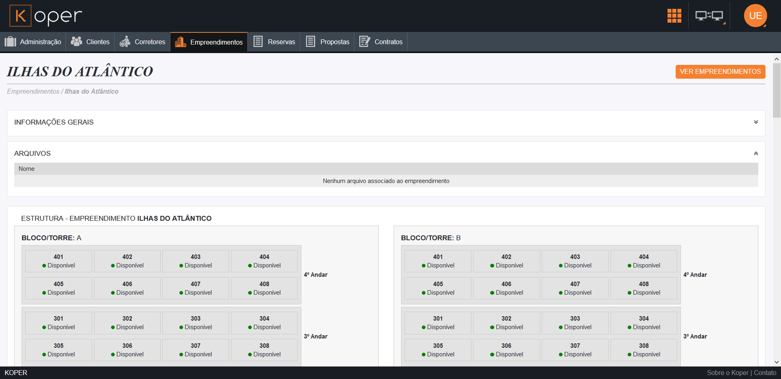 Através do Koper, podemos acompanhar o andamento das vendas a qualquer momento, verificando quais unidades foram vendidas, quais têm propostas emitidas e quais ainda estão disponíveis. Para isso, visite a página Vendas > Empreendimentos e procure o empreendimento desejado.