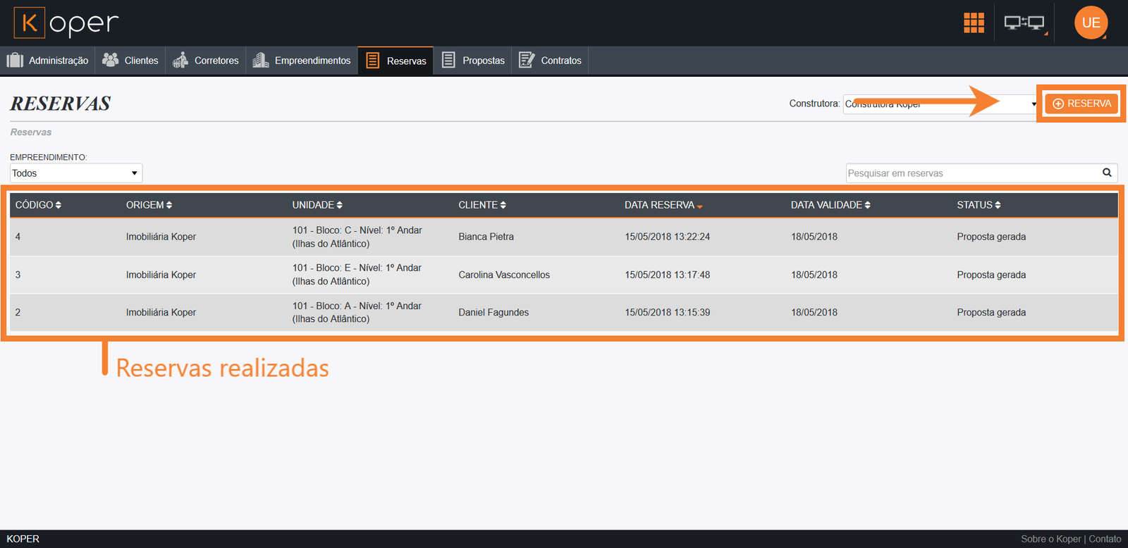 Para efetuar uma reserva como imobiliária, busque a aba "reservas" na barra superior da tela. Logo de início, você verá todas as reservas e propostas geradas para todos os empreendimentos. É possível filtrá-los, porém, por localidade, origem, entre outros: