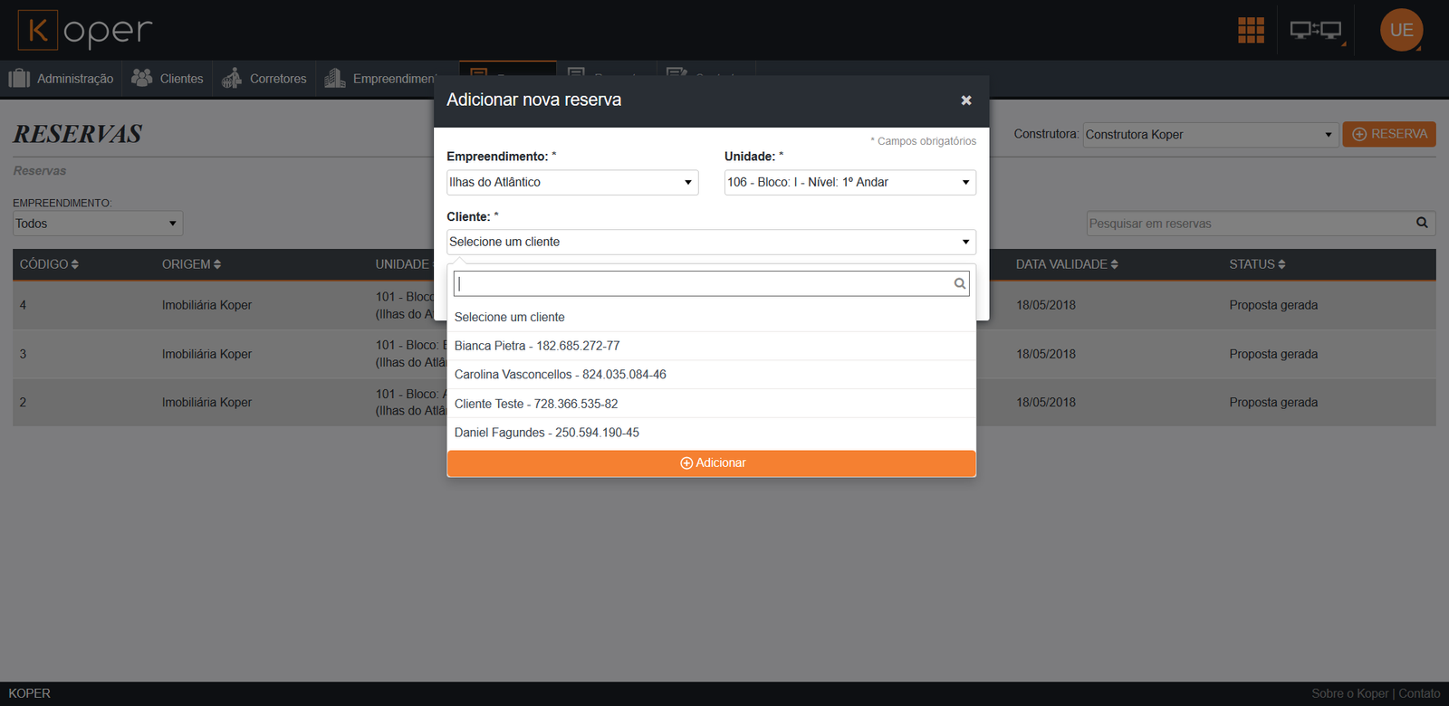 Em seguida, clique no botão indicado acima, sinalizado como "+ RESERVA", o que fará com que uma nova janela seja aberta. Nela, preencha o empreendimento, unidade e o cliente que é parte na proposta, como mostrado abaixo: