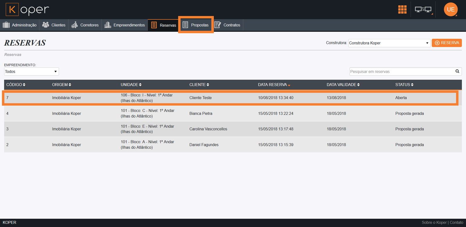 Para transformar essa reserva em uma proposta, em caso de sucesso nas negociações, busque pela reserva na lista mostrada na página anterior e clique nela. Se preferir, pode efetuar esta operação diretamente na aba "Propostas", na aba superior da página: