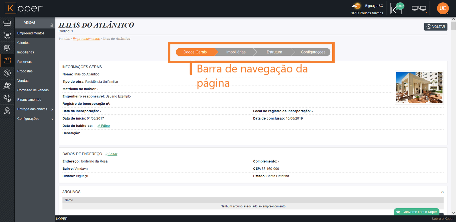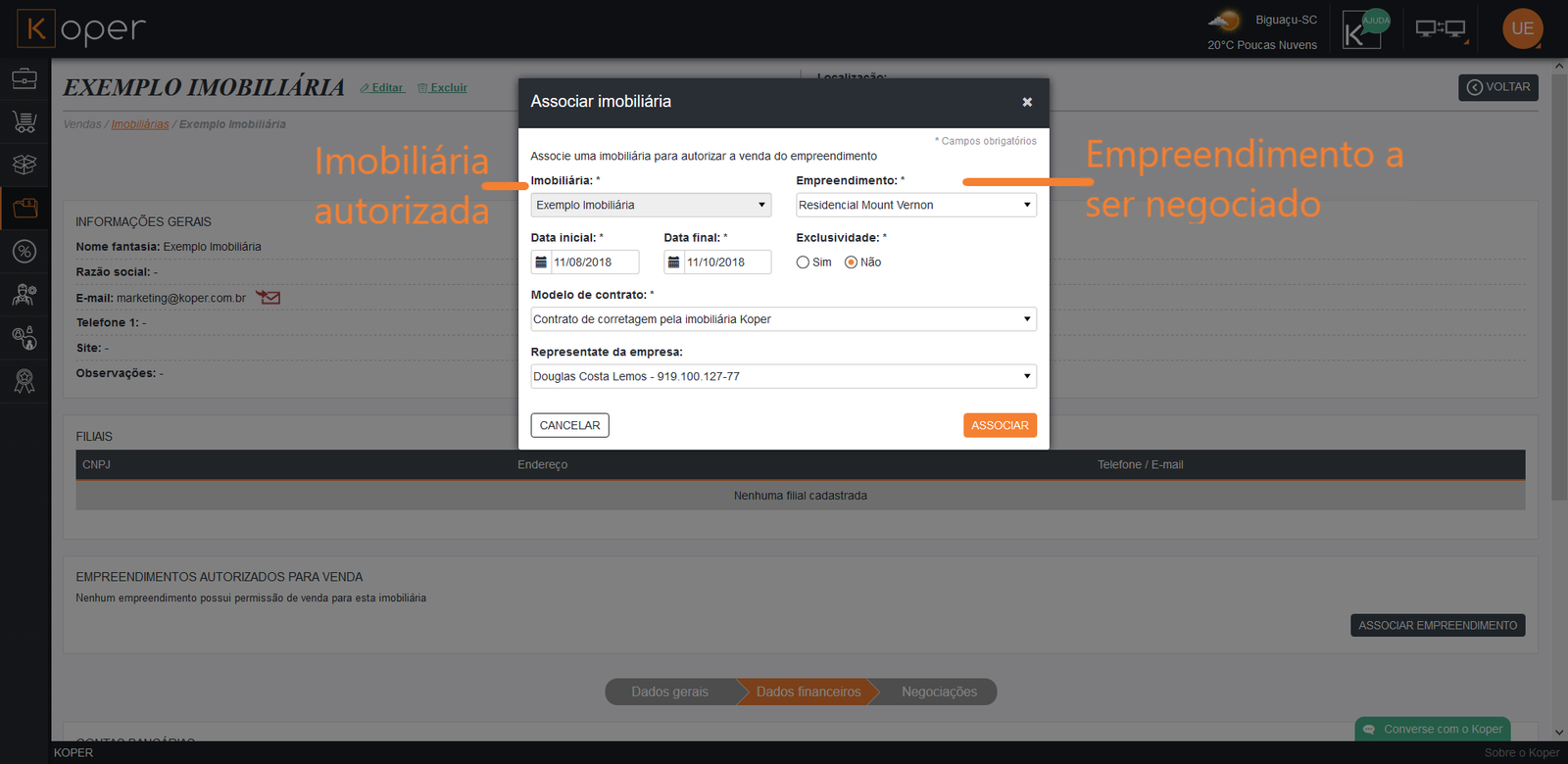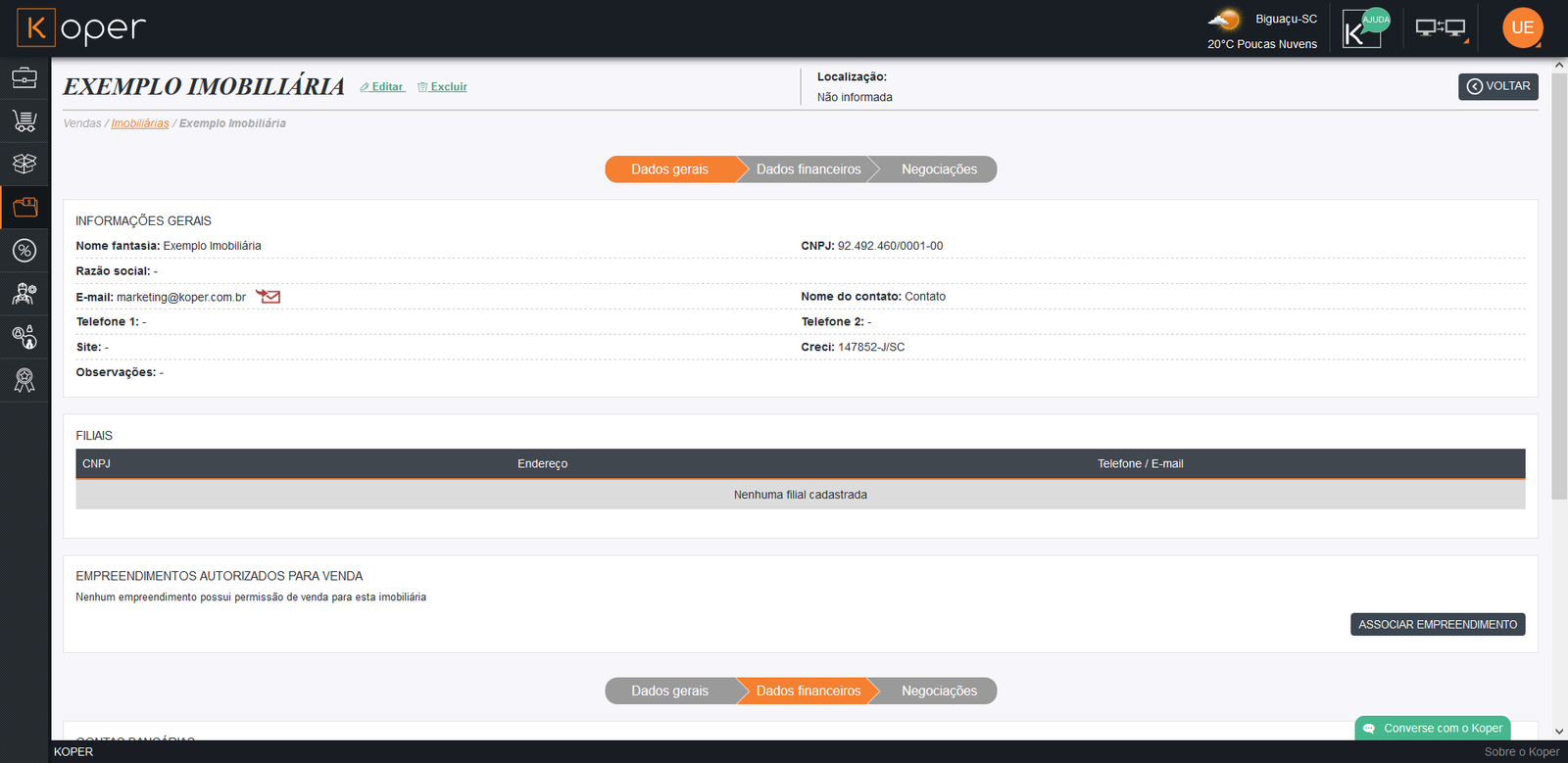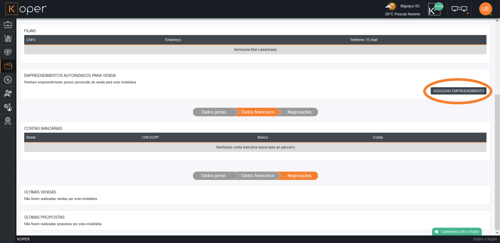 Nela, há o registro geral dessa imobiliária, os dados bancários incumbidos a ela e as negociações em que tomou parte. É também nessa página em que vinculamos empreendimentos construídos para serem negociados pela parceira.