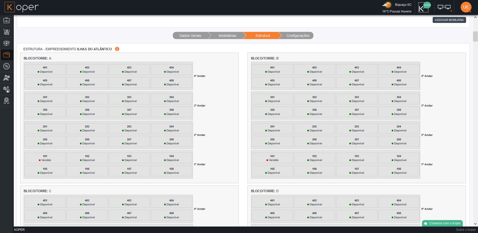Com isso, você terá uma gestão comercial centralizada, ganhando rapidez e elimiando burocracia durante todas as etapas do processo. Com o Koper trabalhando por você, tarefas como reservas, atualização de preços, vendas e emissão de contratos serão feitas em poucos cliques, minimizando erros e concebendo agilidade! Além, claro, de eliminar a possibilidade de vendas em duplicidade e desatualização de preços.